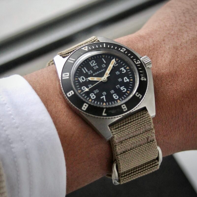 Crafted from marine grade stainless steel, the hardware features a solid one piece design, eliminating the risk of spring bar failure in the strap. Once fitted to a watch, the strap is easy to put on, remove, or adjust in less than 10 seconds. Unlike other straps, this low profile, strategically placed buckle design conforms to the shape of your wrist, preventing hardware scratches on laptops, delicate instruments and surfaces during use.